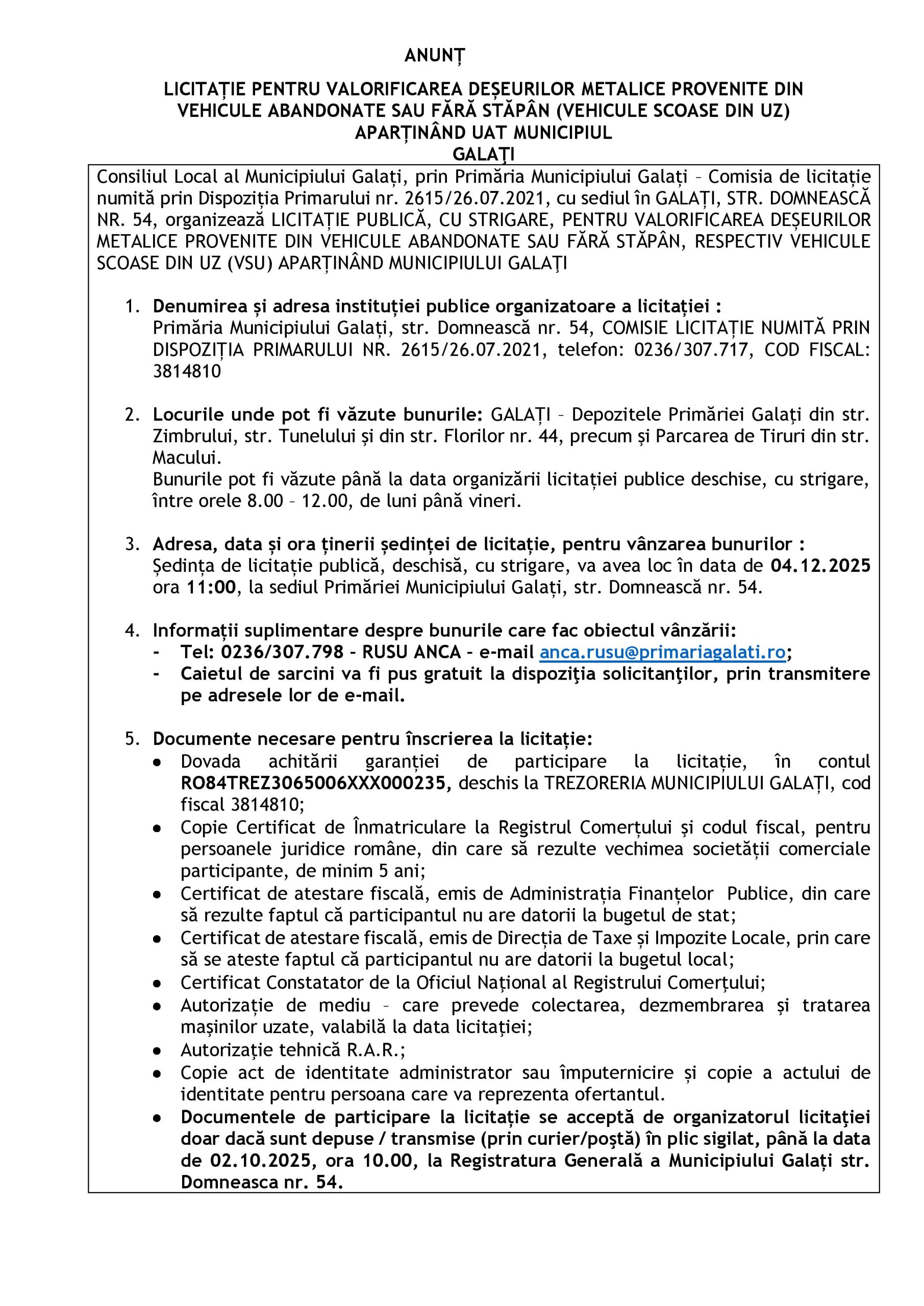 ANUNȚ PRIMĂRIA GALAȚI – LICITAȚIE PENTRU VALORIFICAREA DEȘEURILOR METALICE PROVENITE DIN VEHICULE ABANDONATE SAU FĂRĂ STĂPÂN