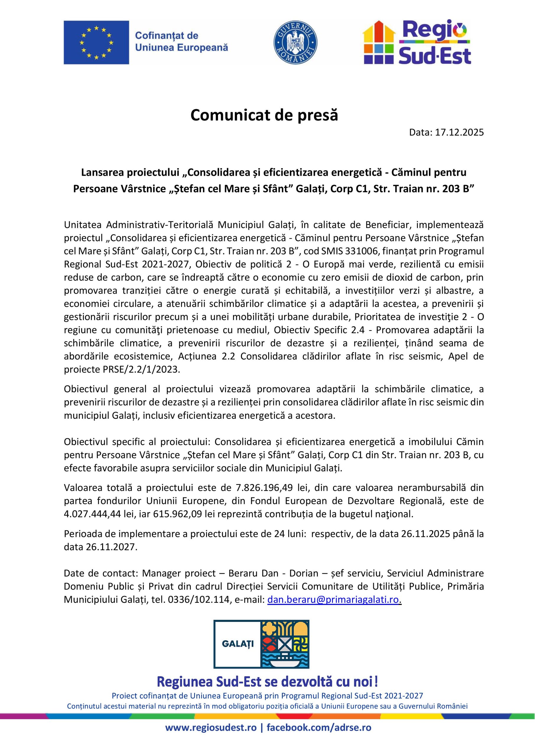 Comunicat de presă – Lansarea proiectului „Consolidarea și eficientizarea energetică – Căminul pentru Persoane Vârstnice „Ștefan cel Mare și Sfânt” Galați, Corp C1, Str. Traian nr. 203 B”