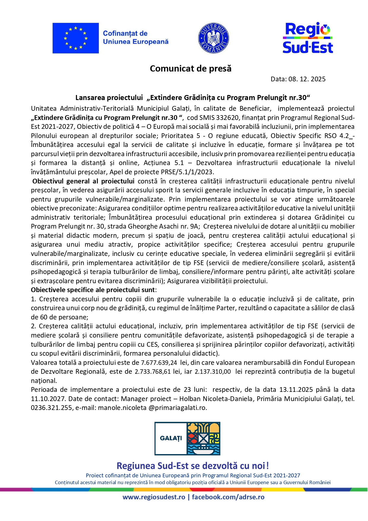 COMUNICAT DE PRESĂ – Lansarea proiectului „Extindere Grădinița cu Program Prelungit nr.30“