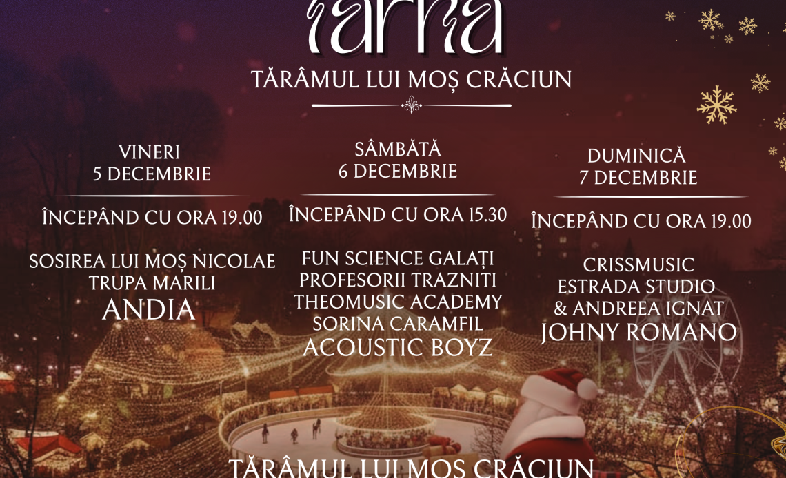 Primăria municipiului Galați informează că, la cea de-a III-a ediție a evenimentului „Feerie de Iarnă – Tărâmul lui Moș Crăciun”, gălățenii de toate vârstele, dar mai ales copiii, sunt așteptați în Grădina Publică pentru emoționanta întâlnire cu Moș Nicolae. Spațiul de poveste, dedicat comunității și spiritului sărbătorilor, propune în weekendul următor nenumărate elemente menite să îmbogățească atmosfera festivă și să creeze experiențe și amintiri pentru vizitatori: patinoarul, trenulețul tematic pentru copii, taxiul lui Moș Crăciun, ateliere creative și campania umanitară „Încalță un copil”, prin care comunitatea este invitată să sprijine copiii din medii nefavorizate. Încălțămintea va putea fi adusă până pe 5 decembrie la punctul de colectare special amenajat în Grădina Publică. Încălțările vor ajunge apoi la copii nevoiași.