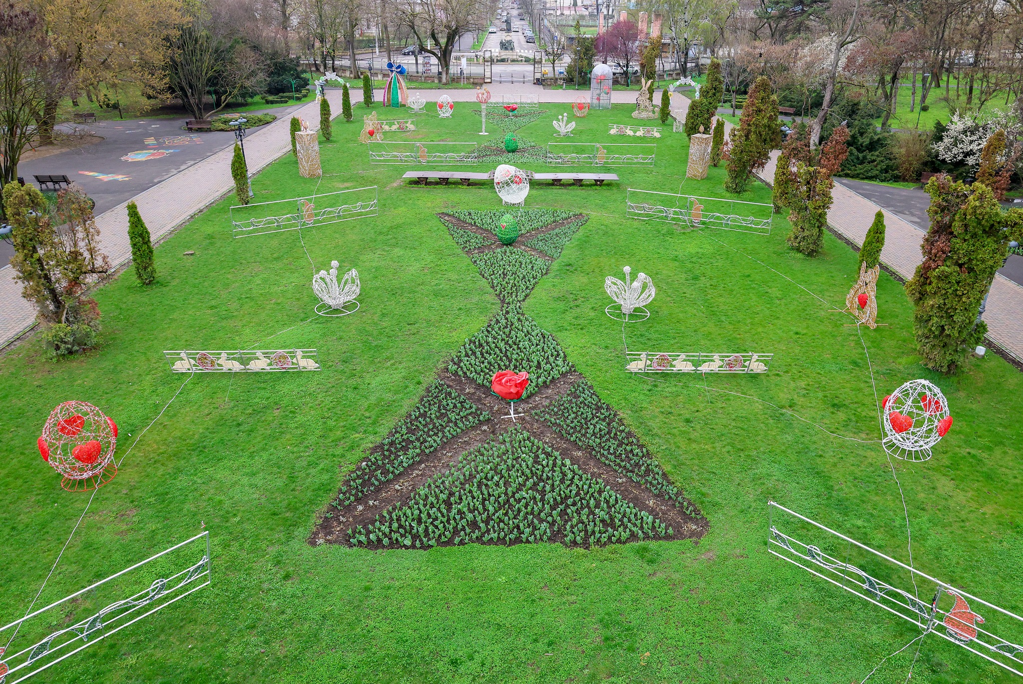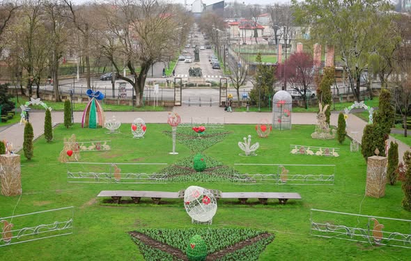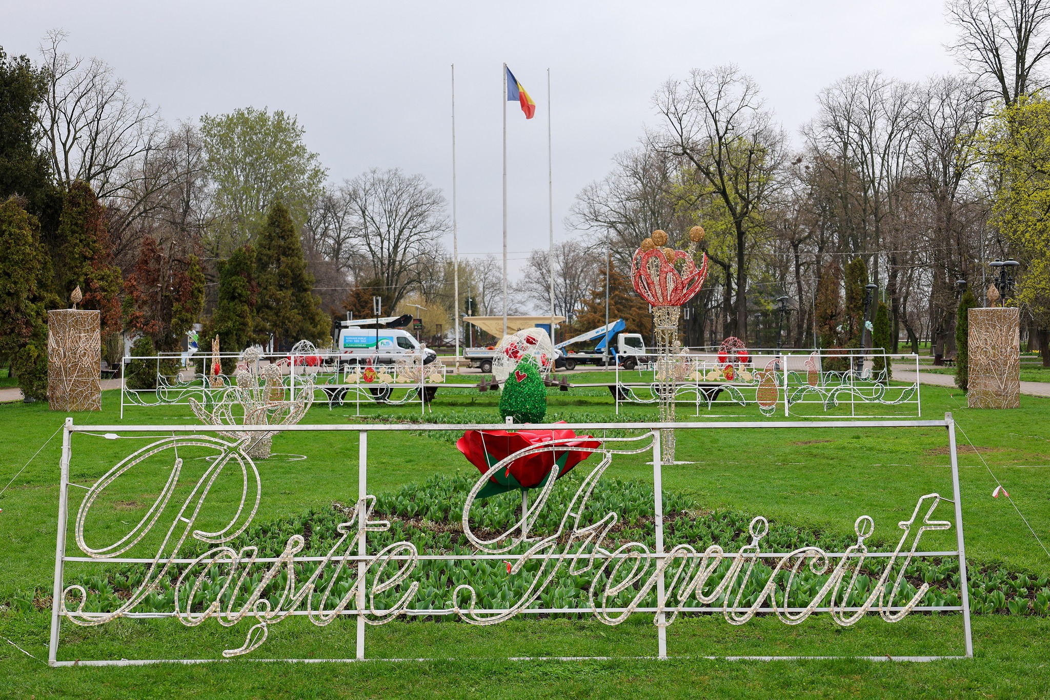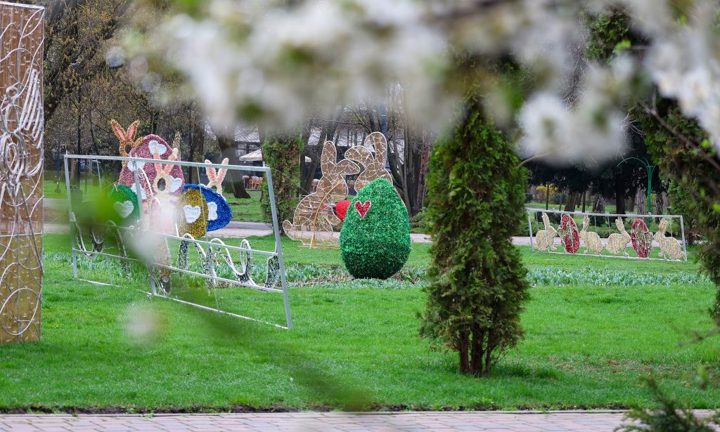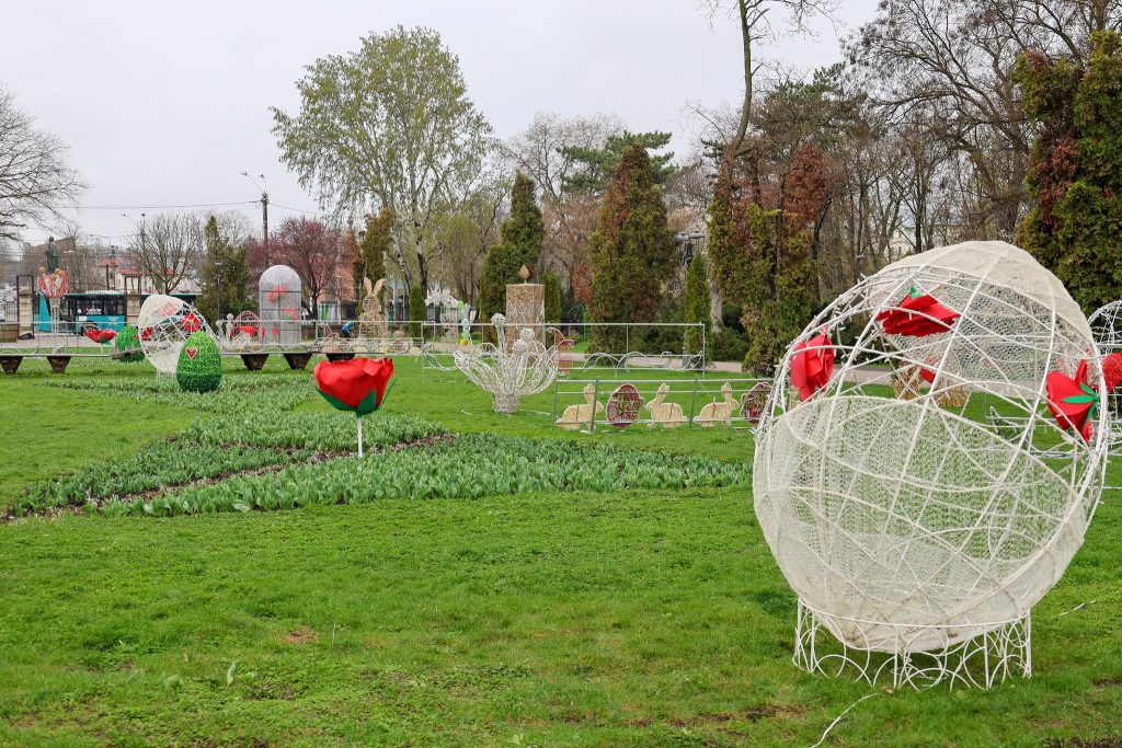 Grădina Publică din Galați, pregătită pentru Florii și Paști. Sâmbătă seara se aprind decorațiunile